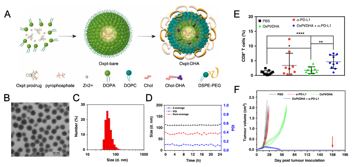 (E) 纳米粒诱导免疫原性细胞死亡联合anti-PD-L1提高CD8+ T细胞比例