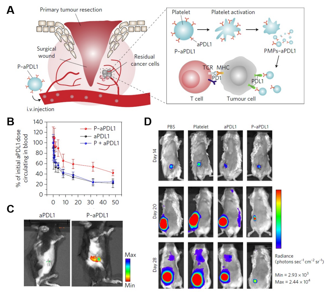 Figure 4. 基于血小板的仿生型药物递送系统表面修饰anti-PD-L1抗体
