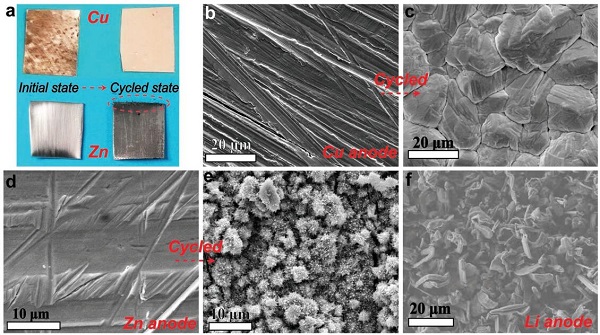 (b-e)初始和循环后的Cu(b,c)和Zn(d,e)负极的扫描电子显微镜(SEM)图像;