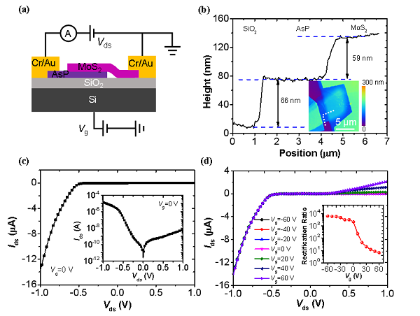 (a)MoS2/AsP范德华异质结器件的结构示意图,(b)AFM高度图,插图为异质结器件的AFM表面形貌图,(c)MoS2/AsP范德华异质结器件(反向整流特性)在Vg=0 V时的输出曲线,插图为对数坐标下的输出曲线,(d)MoS2/AsP范德华异质结器件在不同栅压下的输出曲线,插图为器件的整流比与栅压的关系曲线。