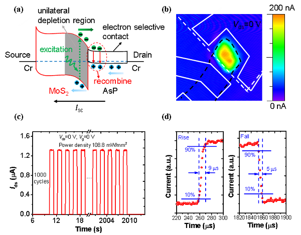 (a)单边耗尽区的MoS2/AsP范德华pp异质结器件在零偏压和520 nm光照下的能带示意图,(b)器件的光电流mapping图,(c)器件在1000个周期性光脉冲下的光开关响应,(d)器件的时间分辨光电流响应。