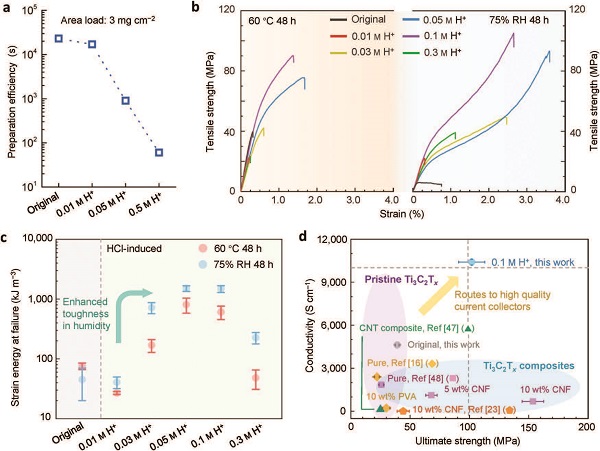 (a)用真空辅助过滤法制备面积密度为3 mg cm-2的原始和纯Ti3C2Tx薄膜的效率;