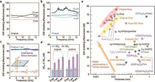 (e)各种材料在不同厚度下的电磁干扰屏蔽性能比较。