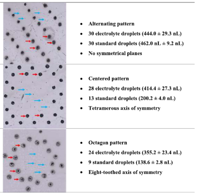 以石英玻璃为载体的纳升级液滴法对所开发图案的评价,所有图像均为7×7 mm大小;红色箭头:电解液液滴;蓝色箭头:标准液滴[2]。