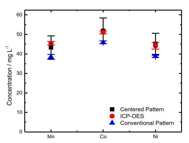 为了验证ICP-OES技术和传统样品应用技术(微升液滴法),使用比实际电池更高浓度的过渡金属中心模式的细节图。用三倍测量表示的误差条。