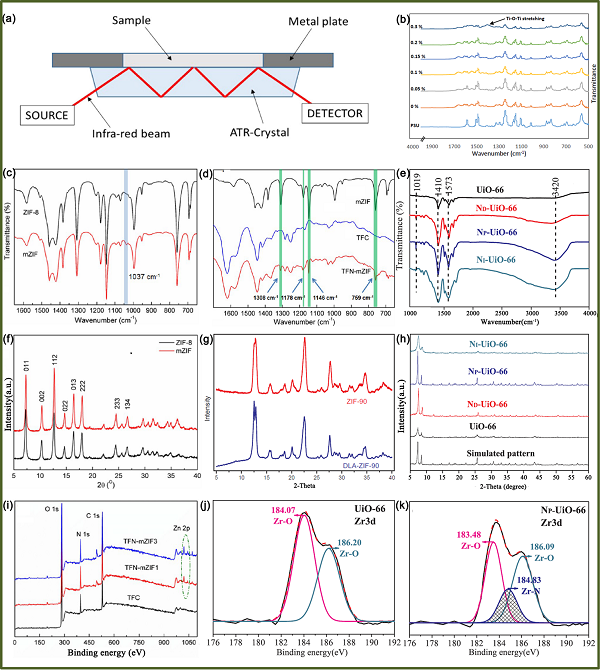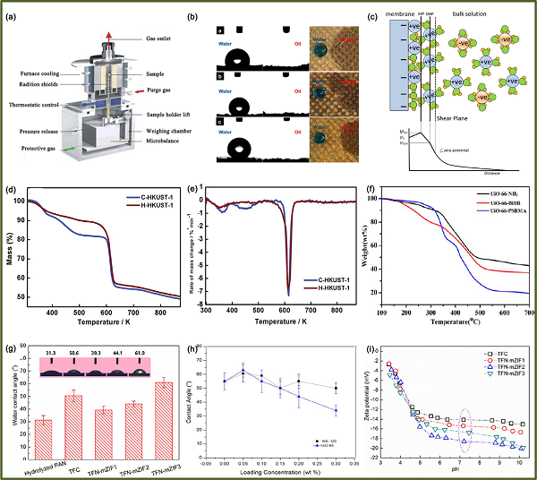 图11. 热重分析,接触角和膜表面电荷的原理图以及表征MOF膜的示意图。
