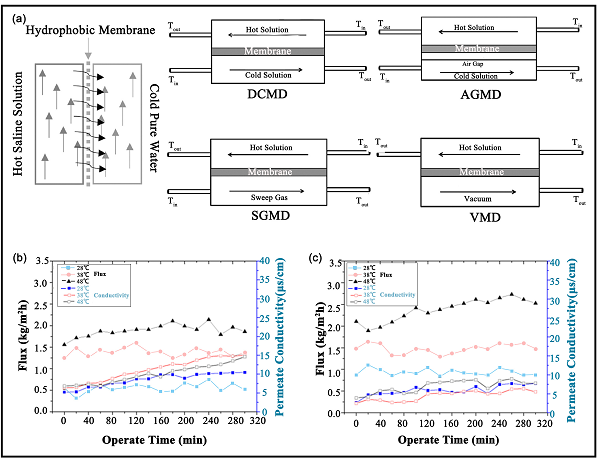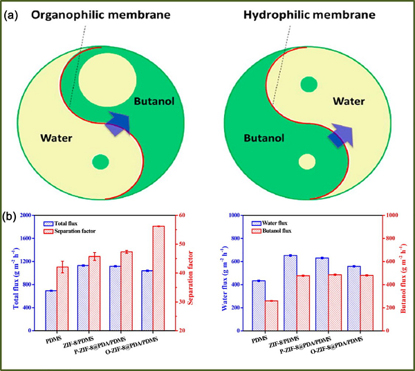 图14. MOF膜渗透蒸发的原理图与性能图。