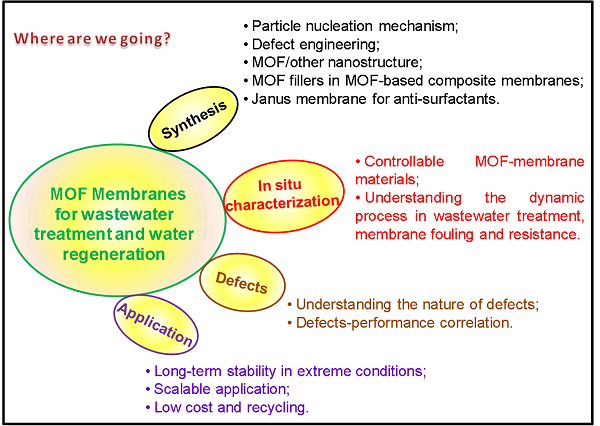 针对MOF膜在设计和合成上的进展,该团队提出以下几点展望:(1)深入探索和解释MOF粒子成核机制;(2)进一步改进MOF作为填料来合成MOF复合膜的相容性;(3)关注MOF的纳米结构;(4)合理利用缺陷工程进行调制,来设计与改性MOF膜;(5)设计一种同时去除表面活性剂和废水而不改变膜表面性质的膜。同时该团队提出利用原位表征技术来描述可控的MOF膜材料以及了解废水处理的动态过程以及膜污染是今后的研究热点。此外,该团队对MOF膜在废水处理与水再生的实际应用方面提出:(1)进一步探讨和研究在极端条件下保持MOF膜的长期稳定性;(2)发展绿色、低成本的合成技术以大规模生产MOF膜,并考虑回收MOF填料。
