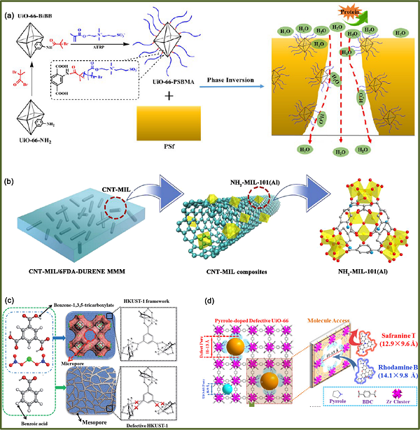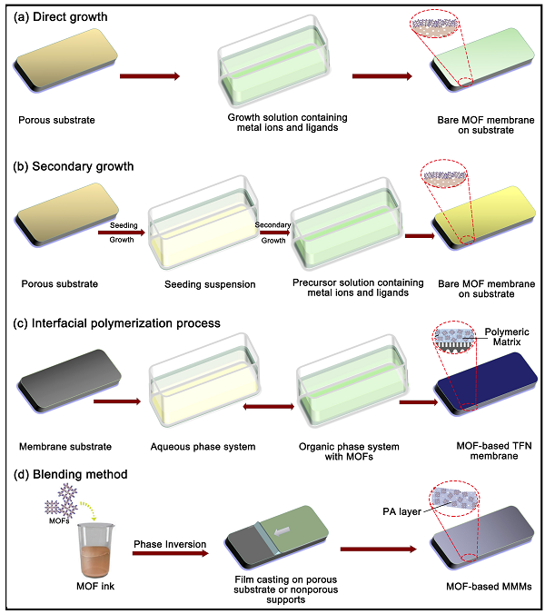 水资源短缺是当今世界面临的全球性环境问题之一,采取废水处理以及水再生的策略对缓解水资源短缺十分有效。其中,膜分离技术因其节能性而备受关注。金属-有机骨架(MOF)是一类由有机配体和无机所构成的高度有序的多孔材料。近年来,由于MOF具备的规则和可调的孔隙结构赋予了其独特的性质,它作为膜分离材料能表现出良好的选择性、渗透性和防污性能,故MOF膜在废水处理和水再生方面受到越来越多的关注。与一些传统的膜材料相比,MOF材料具有以下几点优越性:(1)MOF膜能同时具备优异的选择性和渗透性;(2)MOF具有较好的兼容性;(3)MOF具有规则的、可调的孔隙结构;(4)在某些情况下,MOF可以作为填料回收再利用。