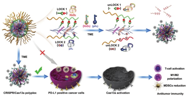 CRISPR/CRISPR相关酶(Cas13a)可以在靶向识别后可通过“附带效应”对肿瘤细胞进行选择性杀伤,这使得其在肿瘤治疗中具有广阔的应用前景。然而,这种“附带效应”并不特别针对肿瘤细胞,当在全身给药时可能会引起安全问题。近日,南开大学刘阳教授,史林启教授和天津医科大学康春生教授(共同通讯作者)在国际著名期刊Adv. Mater.上发表相关研究文章,题目为“Dual-Locking Nanoparticles Disrupt the PD-1/PD-L1 Pathway for Efficient Cancer Immunotherapy”。