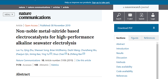 文献来源:Yu, L., Zhu, Q., Song, S., McElhenny, B., Wang, D., Wu, C., Ren, Z. (2019). Non-noble metal-nitride based electrocatalysts for high-performance alkaline seawater electrolysis. Nature communications, 10(1), 1-10.