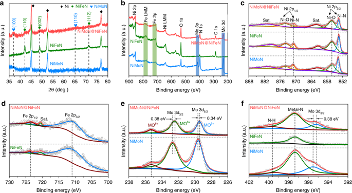 实践是检验真理的唯一标准,数据才是最能证明一切事实的证据。首先评估一下常温下不含氯离子的碱性电解质(1M KOH)这个材料的产氧(OER)活性,可以看到3D核-壳结构NiMoN@NiFeN催化剂表现出明显改善的OER活性,仅需要的277 mV和337 mV过电势就能达到100和500 mA cm−2的电流密度,都优于NiFeN(348和417 mV),NiMoN(350和458 mV)和标准IrO2电极(430和542 mV),同时也比报道过的材料,例如ZnCoOH、Se掺杂的FeOOH、NiCoFe-MOF、FeNiP/NCH的性能更优异。催化剂的活性则是通过塔菲尔斜率来评估的,不出所料,相比于NiFeN (68.9 mV dec−1)、NiMoN (82.1 mV dec−1)和IrO2电极(86.7 mV dec−1)相比,NiMoN@NiFeN催化剂的Tafel斜率表现出相对较小的58.6 mV dec−1,进一步验证了NiMoN@NiFeN快速的OER催化动力学。第二标准验证完,当然下一步就是验证第三标准稳定性,从结果来看,做的设计理念还是很稳固的,材料表现出了很不错的稳定性,在大电流100和500 mA cm-2下测试了48 h之后电流并没有很明显的衰减,说明NiMoN@NiFeN催化剂的高活性的同时也保证了性能的稳定性。但是电解海水除了看氧气析出的性能,同时也不能忘了析出氢气的性能,要不然就只能算是单功能的催化剂而不是双功能了。通过一系列的测试之后,可以看出NiMoN@NiFeN和NiMoN都表现出优异的析氢性能,甚至比贵金属Pt/C表现出更加小的过电势和塔菲尔斜率,其稳定性也能够维持48 h而没有发生很大的性能衰减。碱性电解质中可以稳持活性和稳定性,那在模拟的海水中情况又是怎样还得进一步深入探究一下。这个模拟的海水环境就是在碱性电解质中加入一定的NaCl,模拟海水中含有氯离子的环境,数据结果表明这个材料还是很坚挺的,表现出了跟不含氯离子的碱性电解质中在100和500 mA cm-2电流密度下相当的过电势,说明这个催化剂在盐水中对OER还是有选择性催化的。除了加入氯离子模拟环境,是不是还得真刀真枪的上才能验证这个将军是否是一个够格的将军,作者又在1M KOH的电解质中加入一定量的海水,在深入的测试NiMoN@NiFeN催化剂的OER和HER性能,可以看出在实际的战场上NiMoN@NiFeN的能力还是有一定的衰减的,但这并没有超越生成氯气的那条底线,说明这个材料不管是针对碱性淡水还是碱性海水的电解都还是具有一定的优势。