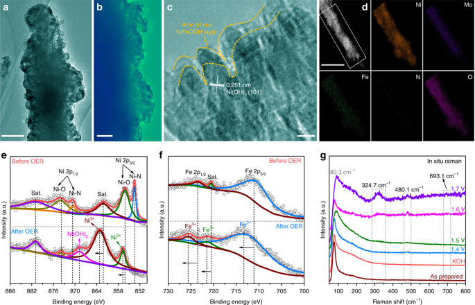 最后的最后,将测试之后的催化剂进一步表征形貌,元素的分布和元素价态的改变来确定整个催化剂在反应过程中的反应活性位点。可以看到催化剂的表面生成了一层薄膜,通过XPS和拉曼光谱来确定这一层物质是无定型的NiFe氧化物(氢氧化物)层和Ni(OH)2层,他们在OER过程中壳表面的NiFeN颗粒演化而来的,而这些NiFe氧化物(氢氧化物)层和Ni(OH)2层是构成了OER过程中真正的催化活性位点,同时这种原位生成的无定型NiFe氧化物和NiFe 氧化物和(氢氧化物)层也对提高海水中氯离子的耐腐蚀性起到了积极的作用,这有助于提高海水电解过程中的稳定性。