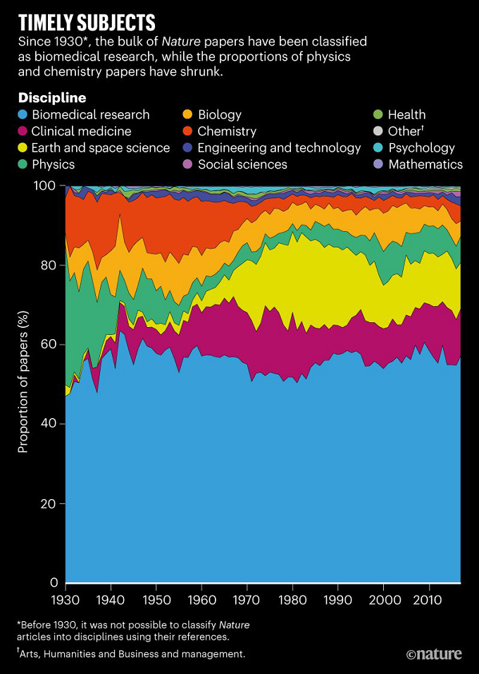 从1930年开始(1930年以前,无法利用参考文献对Nature论文所属学科进行分类),大多数发表在Nature上的论文被归类为生物医学,物理化学的论文占比开始减少,地球科学和空间科学的占比上升。或许随着人类社会经济文化的不断发展,世界对科学的需求也在慢慢改变。