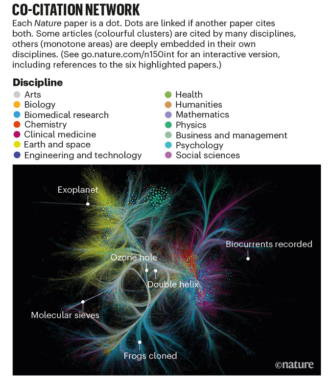 共引情况是分析学科内和跨学科知识流动的一种有效研究方法,《Nature》研究了自1900年以来出版的逾8.8万篇论文,点代表论文,颜色代表学科。如果有其他的科研论文(被Web of Science收录的)同时引用了这篇论文,那么它们之间就产生连接。点的大小代表被共引的次数,花色簇代表的论文被很多学科论文引用,而单色簇代表的论文是大多被自身所属学科引用的论文。Nature也指出如果是对专业性更强的期刊进行相同的共引网络分析,分析的结果会大不相同。但是《Nature》发布的共引网络也彰显了科学史上的独特片段:20世纪30年代放射性元素的研究,80年代末和90年代超导材料的研究以及对其理论基础的深入探讨。
