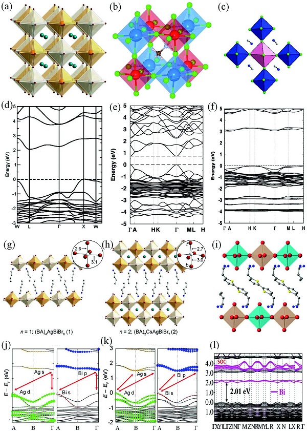 (a-c, g-i)Cs2AgBiBr6, (MA)2TlBiBr6, (MA)2KBiCl6, (BA)4AgBiBr8, (BA)2CsAgBiBr7, (AE2T)2AgBiI8各自的晶体结构。
