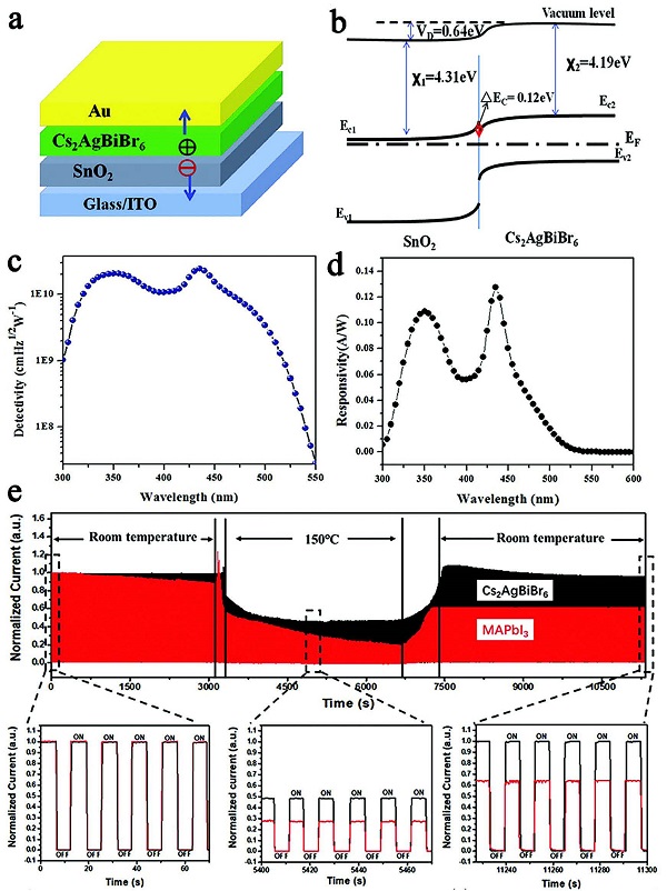 (e)Cs2AgBiBr6光电探测器和MAPbI3光电探测器在450 nm光照下的热稳定性。