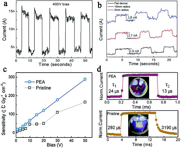 (c)原始Cs2AgBiBr6和PEA-Cs2AgBiBr6单晶X射线检测器在不同偏压下获得的灵敏度。