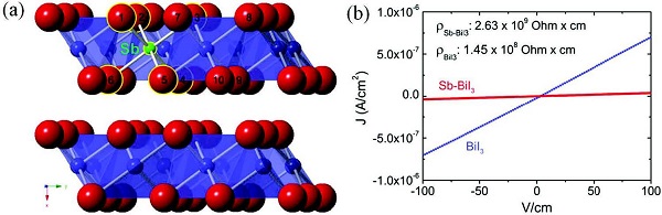(a)SBI的晶体结构和(b)BiI3和SBI单晶探测器的I-V曲线。