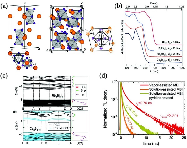 (a)Cs3Bi2I9 (P63/mmc,左)和Rb3Bi2I9 (P21/n,右)的晶体结构。