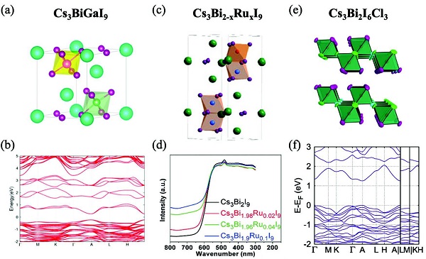 (e-f)Cs3Bi2I6Cl3的结构和计算带隙。