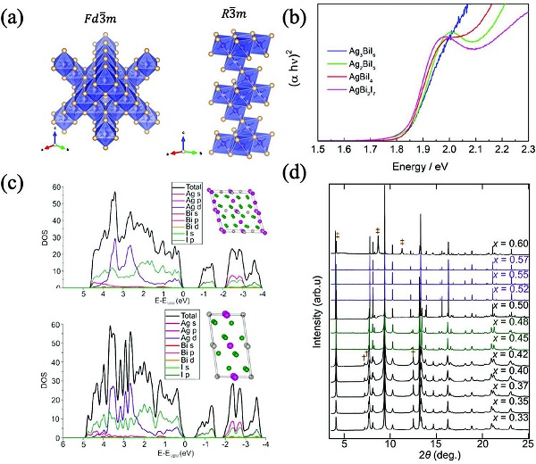 (c-d)Cs3Bi2–xRuxI9粉末样品的结构和紫外-可见光光谱。
