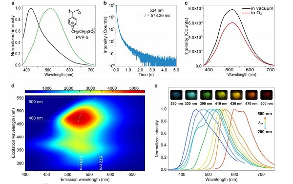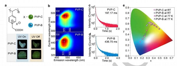 南京工业大学的安众福教授和黄维院士团队报道了离子化策略使聚(4-乙烯吡啶) (PVP)衍生物在室温下具有超长有机磷光现象。在1,4-丁磺酸内酯离子化后,PVP-S磷光体的超长有机磷光寿命为578.36 ms,是PVP的525倍。有趣的是,它能在不同激发光波长的刺激下表现出从蓝光到红光的颜色可调的超长有机磷光现象,这在目前发表的有机发光材料中很少见。上述成果发表于国际期刊Angew上。