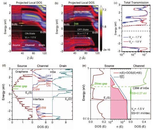 d)投射到石墨烯源的原子剂量,沟道中的InSe和漏极中的InSe,用于开关状态器件;