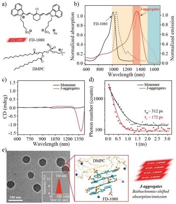 图一、花菁染料FD-1080单体及其 J-聚集体的性能测试