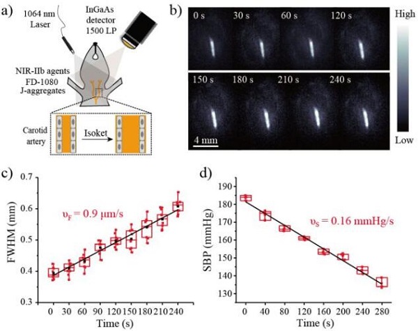 针对上述问题,复旦大学的张凡教授(通讯作者)团队报道了一种新型的NIR-II探针–花菁染料FD-1080 J-聚集体,它是基于花菁染料FD-1080和1, 2-二肉豆蔻酰基-sn-甘油-3-磷酸胆碱(DMPC)的自组装而形成的J-聚集体,其最大吸收和发射波长均超过1300 nm。J-聚集在生理条件下显示出较高的亲水性和稳定性。通过分子动力学模拟证明了磷脂DMPC与花菁染料FD-1080在J-聚集体形成过程中的相互作用。同时,相对于短波长区域内的荧光成像,位于1500 nm以上的荧光成像具有最高的成像效果,包括分辨率,信噪比。此外,研究人员证明了利用J-聚集体可以监测临床使用的Isoket降压药给药后高血压大鼠颈动脉血管的动态变化过程用于评价降压效果。该研究成果近日以“J-Aggregates of Cyanine Dye for NIR-II in Vivo Dynamic Vascular Imaging beyond 1500 nm”为题发表在著名期刊J. Am. Chem. Soc.上,张凡教授课题组的博士生孙彩侠和李本浩为论文的共同第一作者。