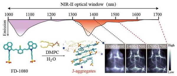 综上所述,作者利用生物相容性的DMPC磷脂和花菁染料FD-1080组装并发生J-聚集以形成新型的近红外二区荧光探针,其可以在1500 nm以上的近红外二区窗口进行体内生物成像。同时,利用分子动力学模拟表明了磷脂DMPC与花菁染料FD-1080在J-聚集形成过程中的相互作用。FD-1080 J-聚集体探针可确保在近红外二区中以更高的信噪比和空间分辨率进行生物成像,也可以监测患有高血压大鼠服用降压药后降压过程中的动态血管变化。总之,该研究为制备近红外二区有机染料探针制备提供了一条新颖的途径,并且该途径可扩展到其他近红外分子染料J-聚集体的制备以在更长的波长下实现优异的生物成像。
