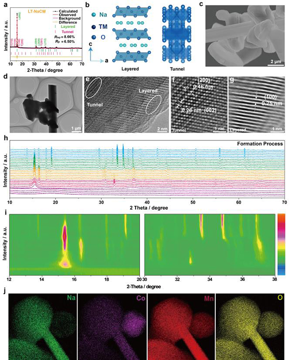 由于地壳中的钠资源十分丰富,钠离子电池(SIBs)被认为是下一代大型固定式电化学储能系统(ESS)的理想选择。近年来,大规模储能技术的发展加速了新型Na+电池系统的开发进展。由于LiMeO2 (Me = Ni, Co, Mn, etc.)的理论比容量高和成本低在锂离子电池系统得到了成功的应用,用于SIBs的钠基层状过渡金属氧化物正极材料NaxMeO2受到了广泛的关注。然而,常规的单相氧化物正极不能在实现高比容量的同时兼顾长循环寿命和优异的倍率性能。例如,尽管Mn基隧道结构Na0.44MnO2正极材料显示出优异的循环稳定性和倍率性能,但是其比容量低。根据以前的报道证实,分层隧道异质结构可以成功地整合具有出色结构稳定性的隧道结构和具有高可逆比容量的分层结构两种优点。同时,异质结构的热门概念已广泛应用于能量存储和转换,电催化,材料科学和光谱技术领域。但是钠离子电池中的层状隧道异质结构的设计仍然不足。此外,理解电池循环过程中固有的协同作用机理,形成过程,结构演变和钠离子的电化学行为也很重要。