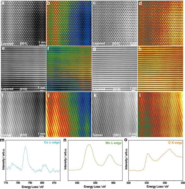 (i-l)HAADF和ABF-STEM图像以及沿[010]晶体学方向观察到的相应的隧道结构彩色图案。