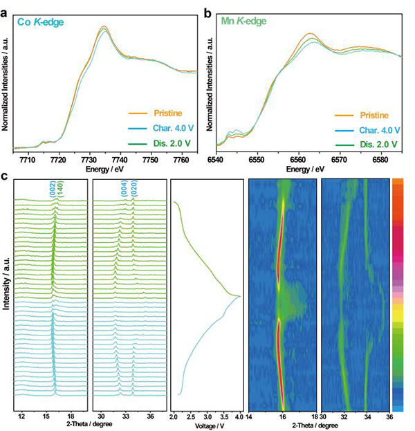 (a,b)在不同充电/放电状态下收集的Co K边缘和Mn K边缘的异位XANES光谱。