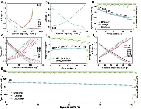 (g)经过各种倍率性能测试后,在5C下100个循环的循环性能。