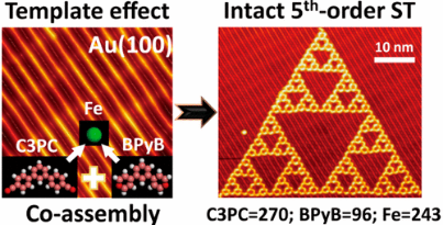 自相似的分形结构在科学,数学和美学中至关重要,能在表面上构造了一系列无分子缺陷的Sierpiński三角形分形。但是,由于动力学增长的限制,分形的最高阶仅为4。在这项工作中,通过模板和共组装方法的组合,在超高真空下成功制备了横向长度为0.05μm的完整的五阶Sierpiński三角形。使用Fe原子,4,4-双氰基-1,1’:3’,1-三联苯和1,3-双(4-吡啶基)苯分子在重建的Au(100)-( 十六进制)表面。结果表明,可以将这种新策略应用于构建各种高阶Sierpiński三角形。