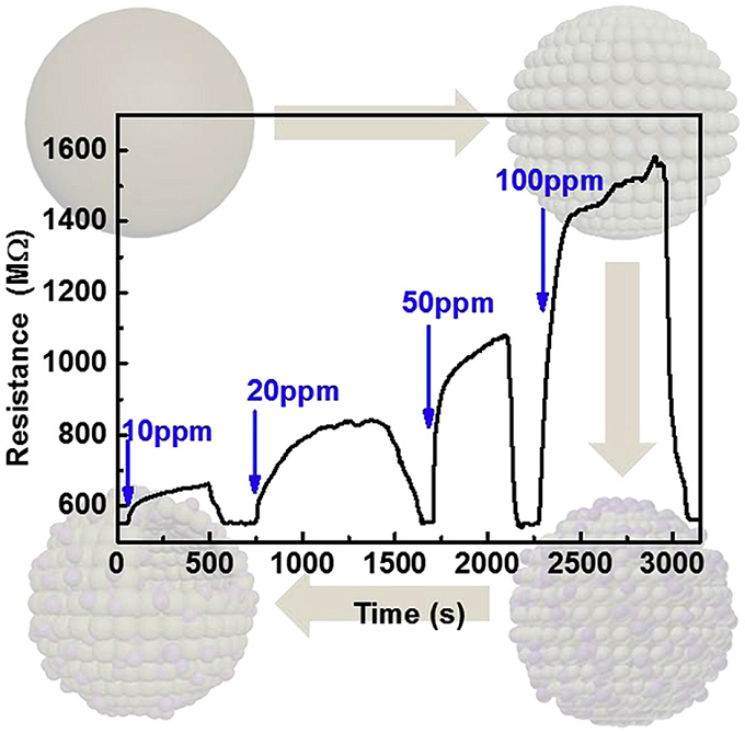 设计和构造异质结构是提高金属氧化物半导体气体传感器的传感性能的趋势。借助碳胶体纳米球并经退火,叶院士课题组成功合成了一种新型的多孔Co3O4/Ta2O5异质结构空心纳米球,超薄空心球壳(〜5 nm)的Ta2O5纳米结构与Co3O4纳米颗粒连接,在接触表面形成异质结。Ta2O5空心球充当支撑模型,阻碍了Co3O4纳米粒子的聚集并具有更大的比表面积,有出色的乙醇检测性能。对10、20、50和100 ppm乙醇的气体响应分别达到20%,50%,90%和180%。Co3O4 / Ta2O5中空纳米球还表现出出色的选择性和可靠的稳定性,这可以归因于Co3O4和Ta2O5接触表面中异质结的形成,从而导致电子耗尽层的扩展。