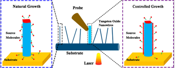在单根纳米线水平上控制一维纳米线的生长对于构建基于多功能纳米线的设备以及深入了解纳米线生长机制至关重要。在这项工作中,彭院士课题组通过在环境扫描电子显微镜内部用纳米探针接触正在生长的氧化钨纳米线,从而首次控制纳米线阵列中单个纳米线的生长。与自然生长的纳米线相比,控制的纳米线表现出加速的径向生长速率和减速的轴向生长速率,轴向生长速率与径向生长速率之比降低了两个数量级。通过纳米探针接触和分离来交替灵活地控制加快和减慢单根纳米线的生长速度。径向生长速率的加速归因于接触诱导的纳米线的接触诱导局部冷却以及由于减少的原子有效扩散长度和减少的平衡源蒸气压而在侧壁上造成蒸气源沉积。这项工作首次实现单个纳米线可控生长,并探究了纳米线生长扩散动力学。生长中的纳米线在近红外光电探测器中显示出潜在的应用。