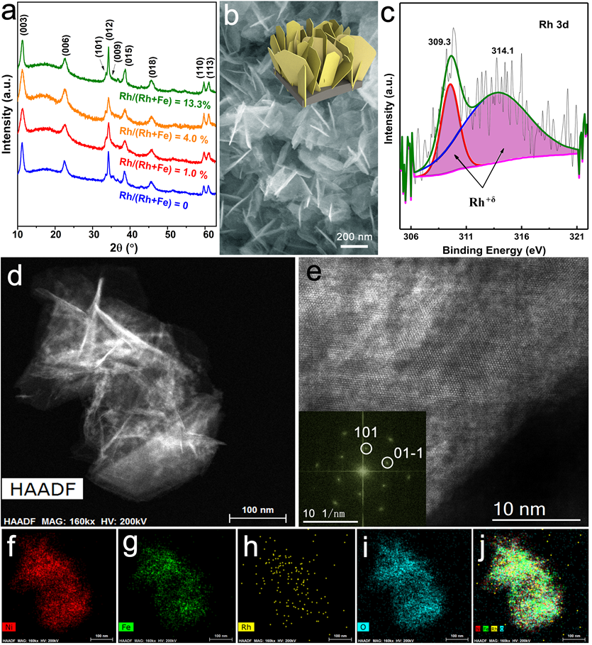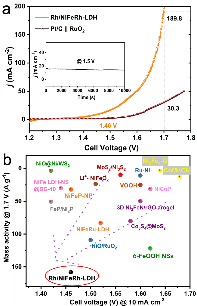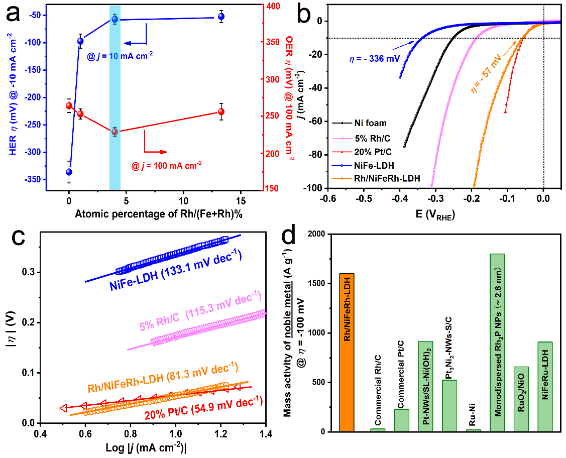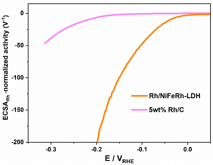 该材料中Rh的活性比商业Rh/C 要高出至少一个数量级,表明HER过程中Rh和NiFe-OH存在强烈相互作用。