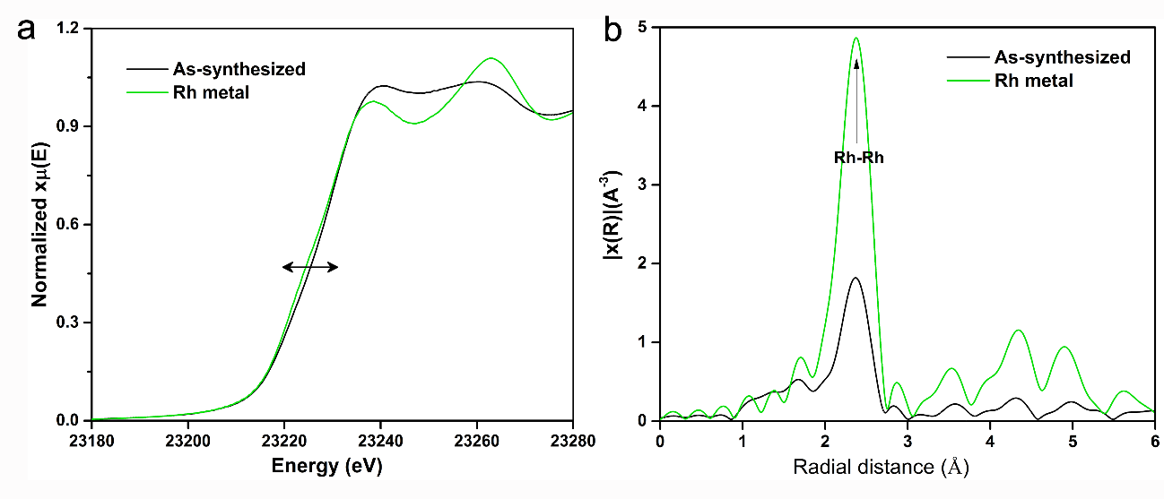 同步辐射谱中却看到了Rh-Rh金属键!假设簇的形状接近球形,FT-EXAFS振幅与平均簇大小0.8 nm一致,基于平均配位数 (5.8) 估计,每个团簇约有13个原子。