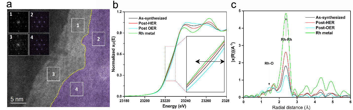 HER 反应后,材料表面越5-10 nm厚度深层结晶度显著降低,表明发生了重构; Rh团簇尺寸有所增加,但依旧小于 1 nm。OER反应后表面Rh-Rh金属键被打断。同时近原位XPS表征证明HER反应后表面只存在金属态Rh,OER反应后表面Rh为氧化态。