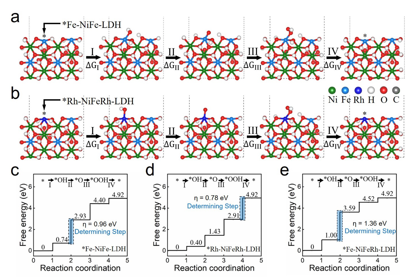 DFT+U计算表明Rh离子取代NiFe-LDH中的位点,其主要OER活性位点变为Rh位点而不再是Fe位点。