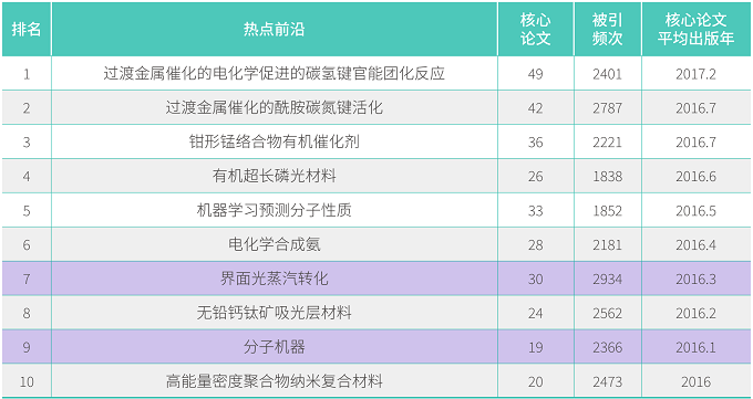 化学与材料科学领域 Top10 热点前沿的施引论文