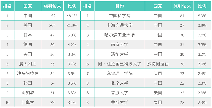 从施引论文角度看,中国、美国、日本等国家积极开展该领域研究,在 Top 施引论文机构中,超过一半来自中国,其中中国科学院表现最为积极。