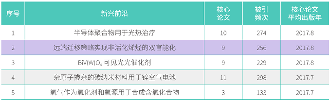 在化学与材料科学领域共有 5 项研究入选新兴前沿,主要涉及光催化剂、锌空气电池及半导体聚合物等材料类新兴前沿和非活化烯烃的官能化及含氧化合物的合成等有机化学反应领域的新兴前沿。其中光催化剂与聚合物研究一直是化学与材料领域的热点研究方向。