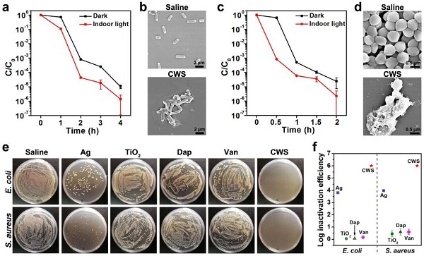CWS NCs处理后金黄色葡萄球菌的失活效率(c)及其SEM图像(d);