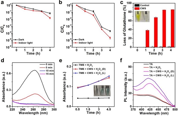 CWS NCs在过氧化氢存在下对TMB(e)和TA(f)的氧化。