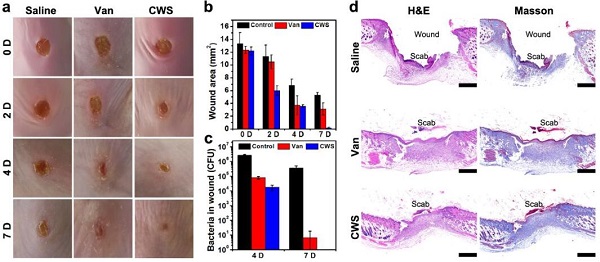 近期,南京邮电大学汪联辉课题组报道了一种具有优异抗菌活性的Cu2WS4纳米晶(CWS NCs)。无论是在有光照还是无光照的情况下,低浓度的CWS NCs(<2 μg/mL)对革兰氏阴性菌(大肠杆菌)和革兰氏阳性菌(金黄色葡萄球菌)的抑菌效率均可达5个数量级以上,显著高于常见的抗菌纳米材料(Ag、TiO2等)及抗生素(万古霉素和达托霉素)。通过抗菌机理的研究发现,CWS NCs不仅具有类氧化酶和类过氧化物酶的催化性质,能够产生多种ROS,而且可以选择性结合在细菌表面,有效的促进ROS对细菌的杀伤。动物实验进一步表明,CWS NCs可以高效清除感染伤口中的耐甲氧西林金黄色葡萄球菌(MRSA),并能够促进伤口的愈合。该研究成果以题为“Efficient Bacteria Killing by Cu2WS4 Nanocrystals with Enzyme-like Properties and Bacteria-Binding Ability”发表在国际著名期刊ACS Nano上。第一作者为单京阳博士生,共同通讯作者为汪联辉教授和宇文力辉副教授。