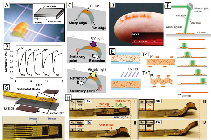 (A)由CLCP多层薄膜结构组成的软体爬行机器人;(B)紫外线与可见光对CLCP层长度变化的影响;(C)基于CLCP复合结构光致变形所产生的尺蠖式爬行运动;(D)光驱使的毛毛虫状软体机器人;(E)依据特定分子取向而制作的LCE薄膜结构;(F)周期性激光束驱动的机器人爬行运动;(G)基于LCE与CB制成的尺蠖型软体机器人以及(H)爬行运动的步态分解。