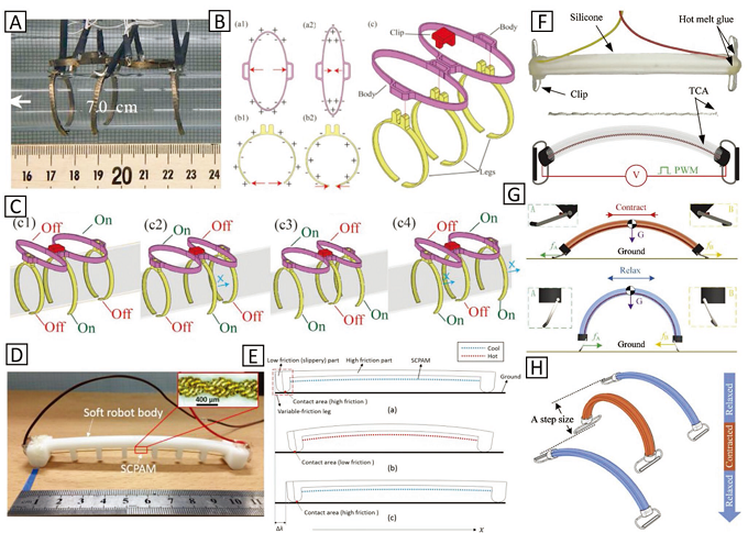 (A)由离子聚合物金属复合材料单元(腿部与身体结构)组成的软体爬行机器人;(B)模块化身体以及腿部的驱动原理以及机器人的组装;(C)依靠身体结构扩张/压缩以及腿部结构加紧/放松产生的爬行运动;(D)由SCPAM驱动的尺蠖式机器人及(E)依靠身体弯曲和各向异性摩擦实现的运动;(F)由TCP驱动器制成的爬行机器人;(G-H)TCP机器人通过各向异性摩擦实现爬动。